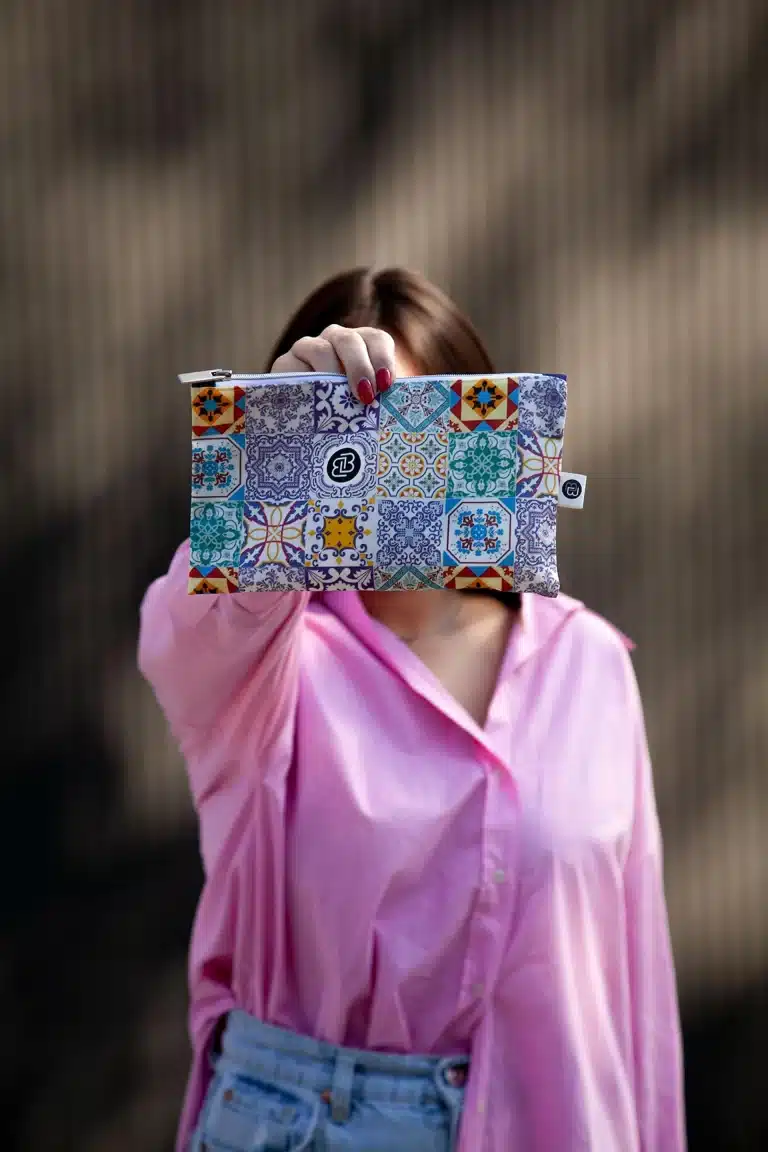 A nossa pochete standard tem 18x11x5 cm em algodão ou RPET.